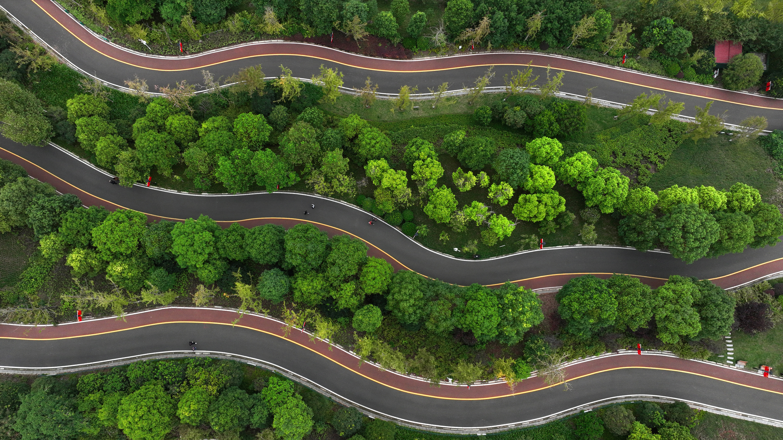 从塔山公园北入口启程,一条宽6米的S形复合绿道顺着山势盘旋而上,四道弯道错落有致,层层叠叠延伸向山间。航拍视角下,平整的路面宛如一条灵动的丝带,环绕在葱郁山林之间,气势颇为壮观。