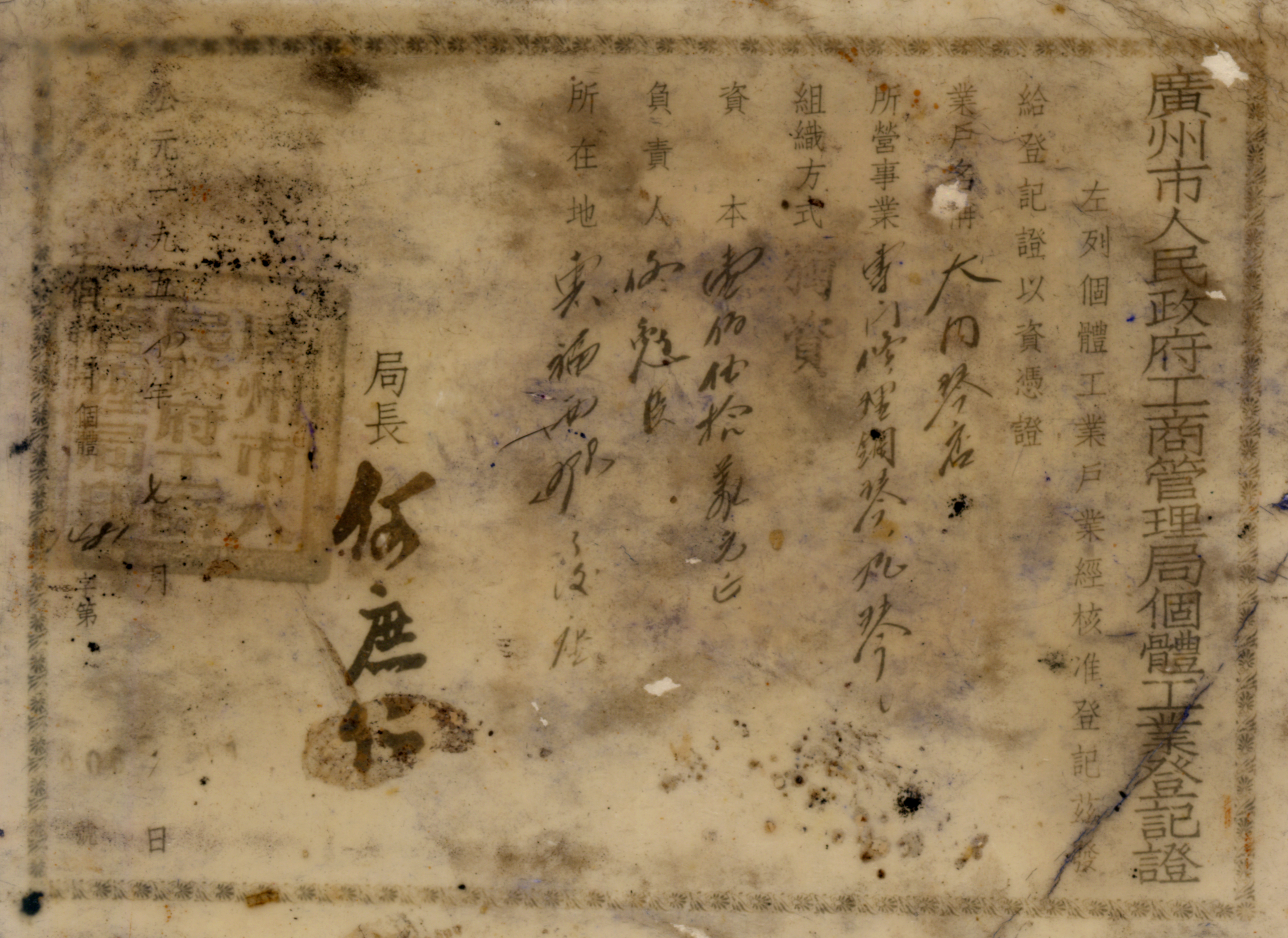 1954年广州市政府颁发给大同琴行的个体工业登记证。 受访者供图
